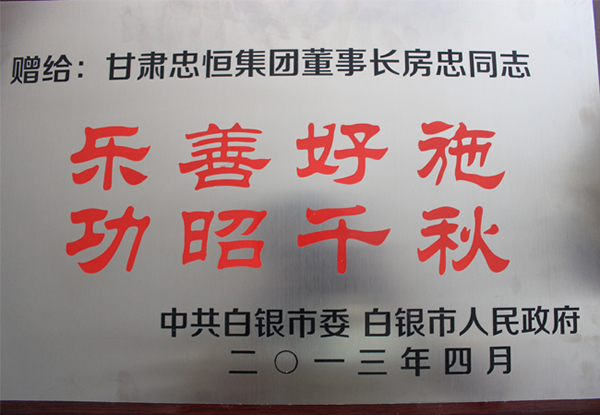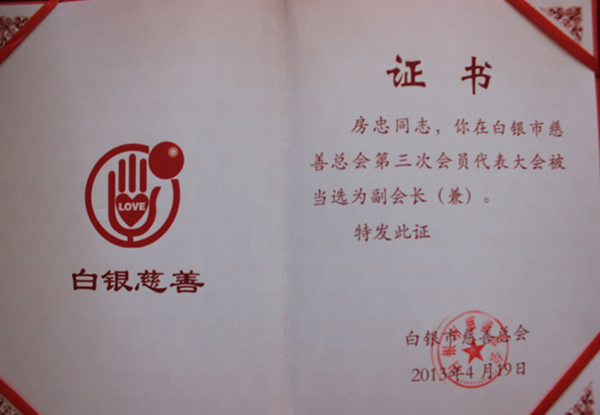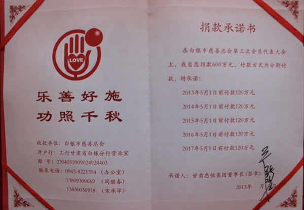 在不久前结束的白银市第三届慈善总会会员大会上,集团公司董事长再次中选为白银市慈善总会副会长,集团公司财务总监房文昌代表董事长加入了大会,并接受了白银市人民政府市长汪海洲的授牌,在此次会员大会上集团公司董事长允许为慈善总会捐款600万元,凭据五年时间分期捐款。